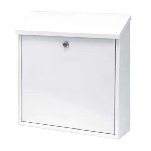 Produktbeskrivning:Enkel brevlåda med cylinderlås, där öppningen är skyddad under locket.