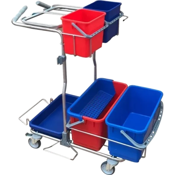 Ergonomisk rengöringsvagn med kromram och hjul som kan låsas. Vagnen är komplett med 6 liter x 2 hinkar, 22 liter x 2 hinkar, 1 droppgaller, avfallsställ och en bricka.