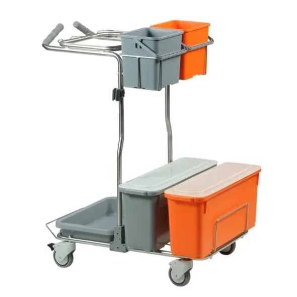 Komplett vagn för mikrofibermoppsystem. Vagnen är ergonomiskt korrekt, hjulen kan låsas. Avfallsställ 2 hinkar med lock för preparerade moppar samt 2 hinkar x 6 liter