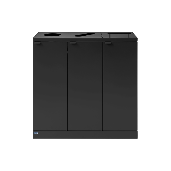 Flexibelt avfallssystem från Bica säkerställer enkel och användarvänlig avfallssortering på arbetsplatsen. Avfallssystemet är designat med 3 fraktioner med respektive 2 öppna inkast och 1 med lyftlock. Syftet med locket är att minimera luktproblem och förhindra bananflugor vid sortering av matavfall. En riktigt smart lösning om påsen inte töms så ofta. Det ena runda inkastet är lämpligt för flaskor/burkar och det andra är avlångt för sortering av papper.