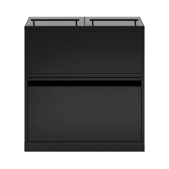 FUNKTIONER Avfallssystemet är utrustat med en låda med soft close för ljudlös och lugn stängning. Det är samtidigt monterat gasdämpare i locket. Avfallssystemet kommer med innerbehållare utrustade med handtag för enkel hantering vid tömning.Lyftlockenmed handtag döljer innerbehållarna och påsarna, så att avfallssystemet behåller en stilren design. Avfallssystemet är flyttbart tack vare de monterade hjulen, som är dolda bakom sockeln. Avfallslösningen levereras med ett magnetiskt väggfäste, som den ska fixeras till.