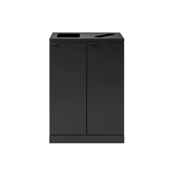 Flexibelt avfallssystem från Bica säkerställer enkel och användarvänlig avfallssortering på arbetsplatsen. Avfallssystemet är designat med 2 fraktioner med 1 öppet fyrkantigt inkast för t.ex. restavfall eller plast och 1 öppet avlångt inkast för papper.