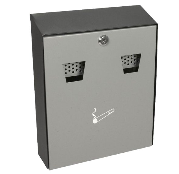Produktbeskrivning: Praktiskt askfat för väggmontering med två inkast. Innerbehållaren är tillverkad i galvaniserat stål. Lätt att tömma genom att öppna frontpanelen med medföljande nyckel.