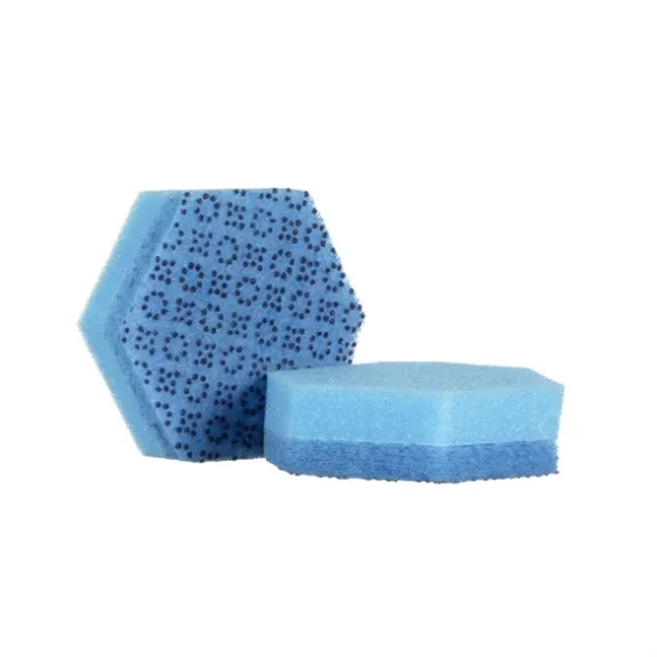 Scotch-Brite™ Anti-Scratch skursvamp 3001HEX har en blå sida med "Power Dot"-yta, som är designad för att snabbt och effektivt arbeta genom envis smuts, men med mindre synliga repor. Skumsvampsidan torkar av ytan. Den speciella sexkantiga formen gör det enkelt att rengöra svåråtkomliga delar av kastruller och stekpannor, och formen gör att svampen ligger bekvämt i handen för maximal effekt med minimal ansträngning. HACCP-certifierad.