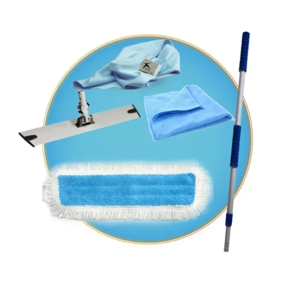 1 x Teleskopskaft med skumgrepp1 xSuperior mopphållare alu/svart 40 cm3 xMikrofiber våt/fuktmopp13 x 47 cm3 xMikrofiberdukar blå40 x 40 cm3 xMikrofiber glasdukar blå40 x 40 cm