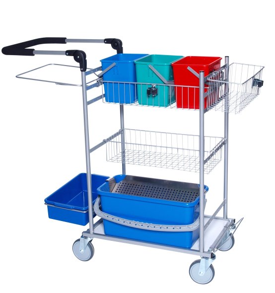 Till vagnen medföljer 3 st 6 liters hink, 1 st 22 liters hink med droppgaller, 1 st trådkorg för diverse, 1 st trådkorg med verktygshållare samt 110 liter avfallsställ med plastbricka som stöd. Dessutom medföljer 3 st. verktygshållare samt 2 st. mophållare. Vagnen levereras med 4 st 125 mm hjul med kullager