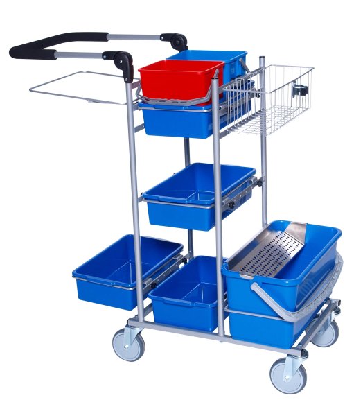 Till vagnen medföljer 1 st. plastbricka, vari det sitter 2 st. 6 liter hink, 1 st 22 liter hink med droppgaller, 2 st plastbrickor för diverse, 1 st trådkorg med verktygshållare samt 110 liter avfallsställ med plastbricka för säckstöd.