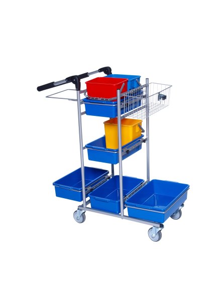 Till vagnen medföljer 2 st plastbackar med 3 st. 6 liters hinkar, 1 st trådkorg samt 2 st. plastbackar för diverse förvaring och 60 liters avfallsställ med plastback för stöd