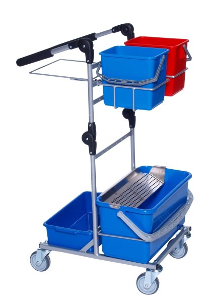 Till vagnen medföljer 2 st 6 liters hink, 22 liter hink med droppgaller samt 60 liter sopställ med plastbricka som stöd. Dessutom medföljer 2 st. verktygshållare samt. 1 st. mophållare.