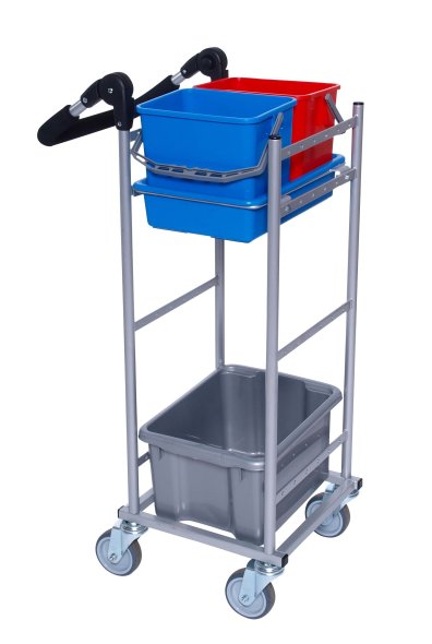 Denna vagn tillhör kategorin Ergo Slimline. Med sina 40 x 40 cm på bottenramen tar vagnen minimalt med plats när handtaget är nedfällt. Till vagnen medföljer 1 st plastlåda, i vilken det sitter 2 st 6 liters hinkar, samt 1 st mopplåda. Vagnen levereras med 4 st 100 mm hjul