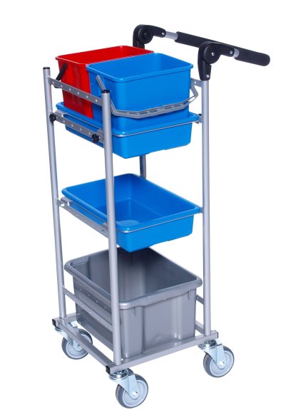 Denna vagn hör till kategorin Ergo Slimline. Med sina 40 x 40 cm på bottenramen tar vagnen minimalt med plats när handtaget är nedfällt. Till vagnen medföljer 1 st plastbricka, i vilken det sitter 2 st 6 liters hinkar. Dessutom 1 st plastbricka samt 1 st mopplåda för diverse. Vagnen levereras med 4 st 100 mm hjul