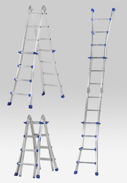 Knivgångjärnet i stegens topp kan med ett lätt grepp, utan verktyg, påverkas och stegen kan fällas ut till en lång anliggande stege.
