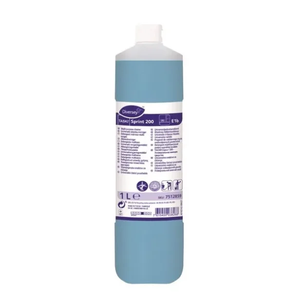 Diversey TASKI Sprint 200 – 1 LiterEffektiv rengöring med snabb och strimmelfri torkning!TASKI Sprint 200 från Diversey är det ultimata universalrengöringsmedlet för daglig användning på alla tvättbara ytor. Det är pH-neutralt, snabbverkande och lämnar en frisk doft vid varje användning. Med en unik sammansättning av effektiva tensider och Odour Neutralizing Technology (O.N.T.), får du en produkt som levererar strimmelfri torkning och långvarig fräschhet.Egenskaper:• pH-neutralt – skonsam mot ytor