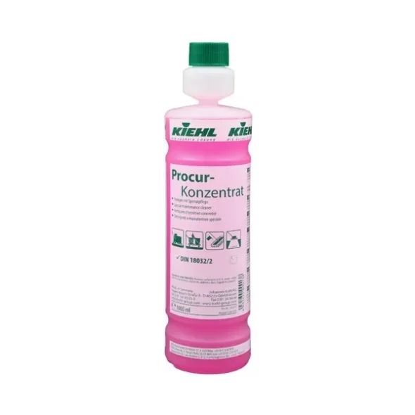 Procur-Koncentrat är ett effektivt rengöringsmedel som lämnar en speciell polerbar vårdfilm, som motverkar ansamling av smuts som tuggummirester och svarta klackmärken. Vid regelbunden användning förnyas vårdfilmen, vilket förhindrar ansamling och gör golvet lätt att rengöra. Produkten torkar upp med en randfri sidenmatt glans och kan med rätt dosering göra ytor halksäkra.