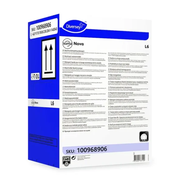 Suma Nova L6 är ett effektivt, starkt alkaliskt flytande maskindiskmedel som kan användas i en- och flertanksdiskmaskiner. Kombinationen av lut och kalkbindande komponenter tar effektivt bort smuts. Den höga halten av kalkbindande komponenter förhindrar kalkavlagringar i hårt vatten.