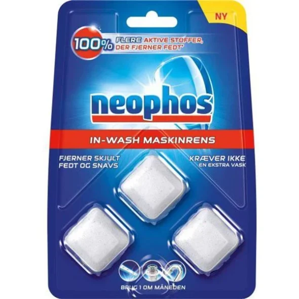 Den nya Neophos in-wash maskinrengöring med 100 % fler aktiva ämnen, som tar bort fett*, kräver ingen extra tvätt. In-wash maskinrengöringstabletter tar effektivt bort fett och matrester från maskinens dolda delar, såsom spolarmar och filter, medan maskinen diskar. Använd en tablett en gång i månaden tillsammans med Neophos diskmedel.