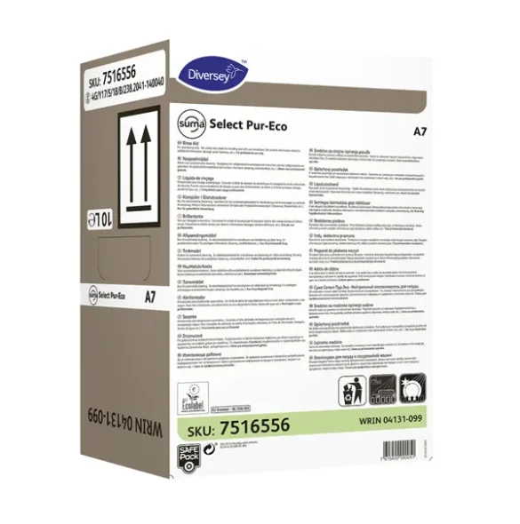 Suma Select Pur-Eco A7 är speciellt utvecklat för användning i en rad olika diskmaskiner. Produktets speciella sammansättning av nonjoniska tensider gör att ytspänningen reduceras i slutsköljvattnet och förhindrar droppbildning, så att vattenfilmen försvinner i ett tunt lager, vilket också minskar torktiden. Den speciella sammansättningen förhindrar också skumbildning i diskmaskinen.- Säkerställer snabb torkning