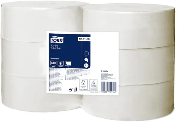 Tork Jumbo-systemet säkerställer effektiv underhåll och färre utgifter, eftersom det kan rymma mycket mer toalettpapper. Tork 1-lags Jumbo Toalettpapper Universal täcker ett toaletts grundläggande behov och är därmed ekonomiskt och perfekt för toaletter med hög användningsfrekvens.