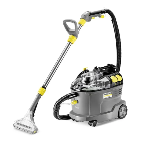 Den professionella Puzzi 8/1 Adv mattvätt från Kärcher levererar utmärkta och hygieniska rengöringsresultat tack vare sin utmärkta sugförmåga, som säkerställer att textilytor snabbt kan användas igen. För detta ändamål sprutar Puzzi 8/1 Adv rengöringsmedel djupt in i textilfibrerna och suger sedan upp det smutsiga vattnet, vilket gör den perfekt för rengöring av möbelklädsel, mattor och andra textilytor. Den robusta, kompakta designen säkerställer en lång livslängd och därmed hög kostnadseffektivitet - idealisk för BSC, hotell- och restaurangbranschen eller för rengöring av bilinteriörer. Maskinens lock, möbelmunstycke och golvmunstycke är genomskinliga, så att man bättre kan se det smutsiga vattnet. Ett inspektionsfönster på handtaget ökar övervakningsmöjligheterna ytterligare. Puzzi 8/1 Adv har en låg vikt och ett ergonomiskt bärhandtag, så att den kan transporteras med en hand. Stora tryckknappar, som kan manövreras med hand eller fot, ökar också användarvänligheten.