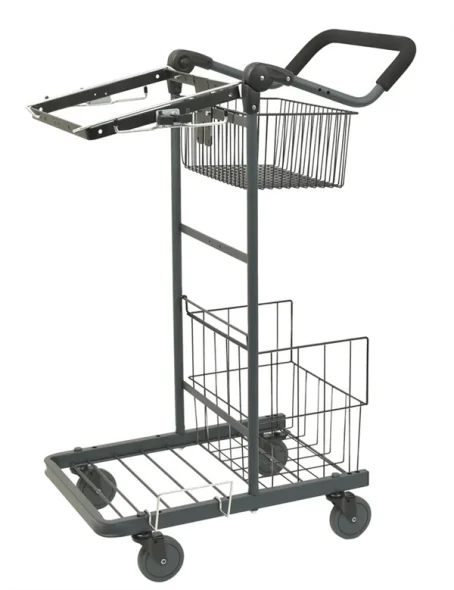 Stabil basvagn. Generöst med utrymme för material. Justerbart handtag. Plats för 2 stativ. Lättrullande 100 mm hjul. Krokar.