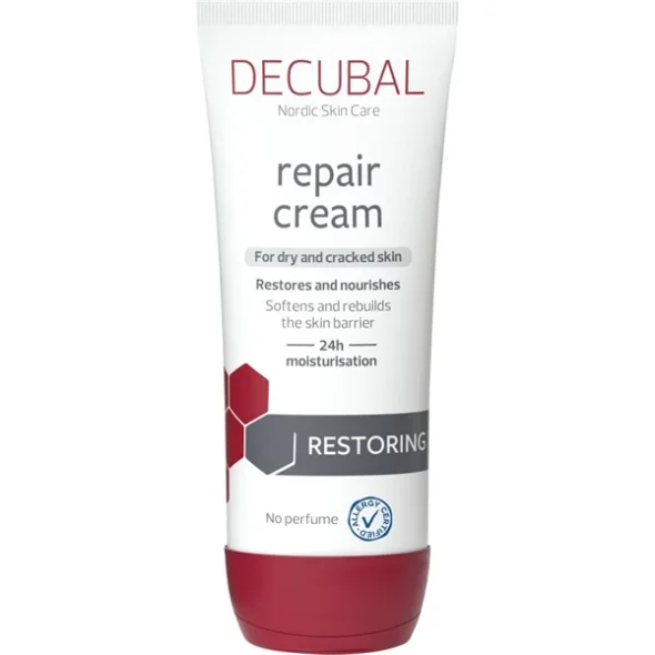 Produktbeskrivning:Decubal Repair Creme är en extra närande och fuktgivande kräm med 70% fett, som vårdar och mjukgör även det torraste hudproblemet och innehåller ceramider, fyra fettsyror, kolesterol och vitamin B, som aktiverar hudens egen produktion av de fetter som den torra huden saknar. Krämen innehåller också jojobaolja, som vårdar, återfuktar och mjukgör huden. Krämen har en lätt konsistens, som gör den behaglig att använda även på känslig och sprucken hud. Lämplig för mycket torr, irriterad och skadad hud. Är också bra för barn.