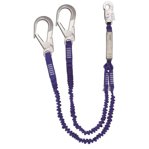 Prisvärd dubbel fallskyddslina! I obelastat tillstånd är linan elastisk, vilket minskar längden med 25%, så man inte snubblar på linan. Absorberlina och elastik är inkapslade i ett hölje. Förankring över användarhöjd föredras. Karbinhake har 18 mm öppning, maxikarbinhakarna har 60 mm öppning. EN 355.