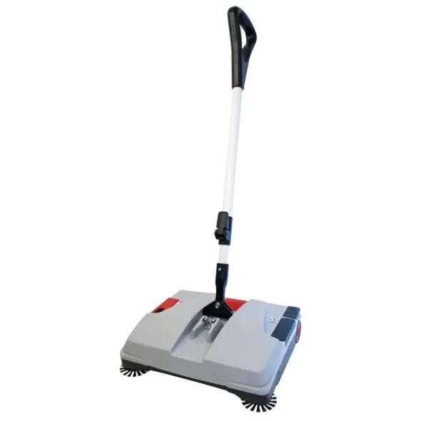 Batteridriven sopmaskin med sidoborstar. Justerbart handtag. Hopfällbar, kan tas med på städvagnen. Låg, endast 10 cm, kommer under låga möbler. Stor behållare för damm och smuts. Storlek 35x30x10 cm. Driftstid 45 min. (Hårt golv).