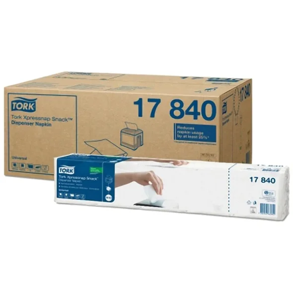 Produktbeskrivning:Tork Xpressnap Snack® vita 1-lager dispenserservetter är lämpliga för platser med fokus på praktisk funktion och driftskostnader, och där snacks, drycker eller mat i mindre portioner serveras.