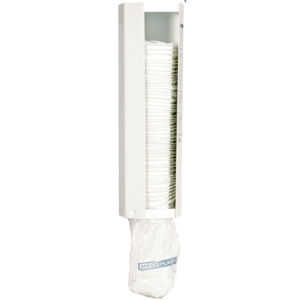 Dispenser för kräkpåsar. Monteras på väggen. Ger en hygienisk förvaring och enkel hantering av påsarna.